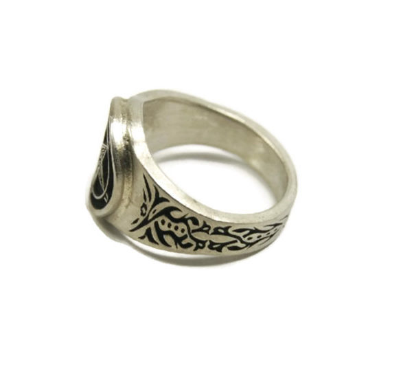 The beautiful pewter ring is a silver color and the background is blackened to bring out the fine detail of the design.